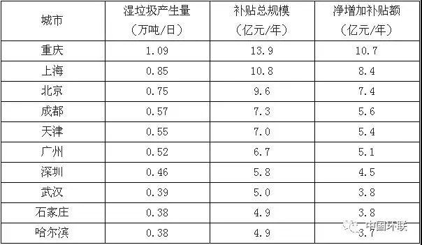 人口規(guī)模前十的垃圾分類試點城市廚余垃圾處理補貼測算