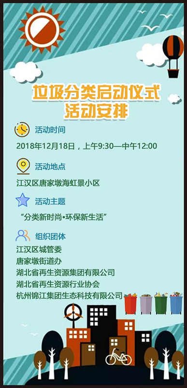 湖北省再生資源集團有限公司*湖北省再生資源行業(yè)協(xié)會*杭州錦江集團生態(tài)科技有限公司*江漢區(qū)城市綜合管理委員會*唐家墩街道*武漢交發(fā)物業(yè)管理有限公司,共同攜手,深入武漢,助力江漢,開啟垃圾分類之旅!