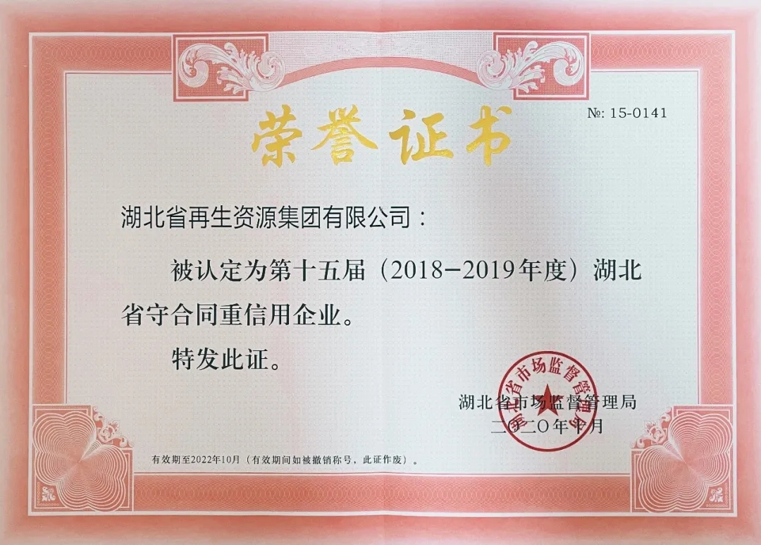 本次獲評“守合同重信用”企業(yè),是對湖北省再生資源集團一直以來履職盡責(zé)、守約重信的高度肯定,也是對湖北省再生資源集團繼續(xù)做好本業(yè)、擔(dān)當國企責(zé)任的有力激勵。